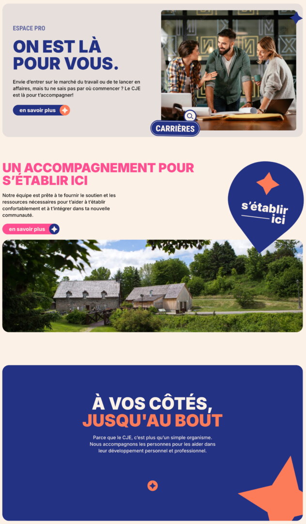 La nouvelle identité du CJE nous a offert une palette de couleurs vibrantes et une flexibilité créative stimulante. Ces teintes dynamiques ont insufflé une énergie nouvelle au site, reflétant parfaitement le dynamisme de l’organisation et de sa clientèle jeunesse.